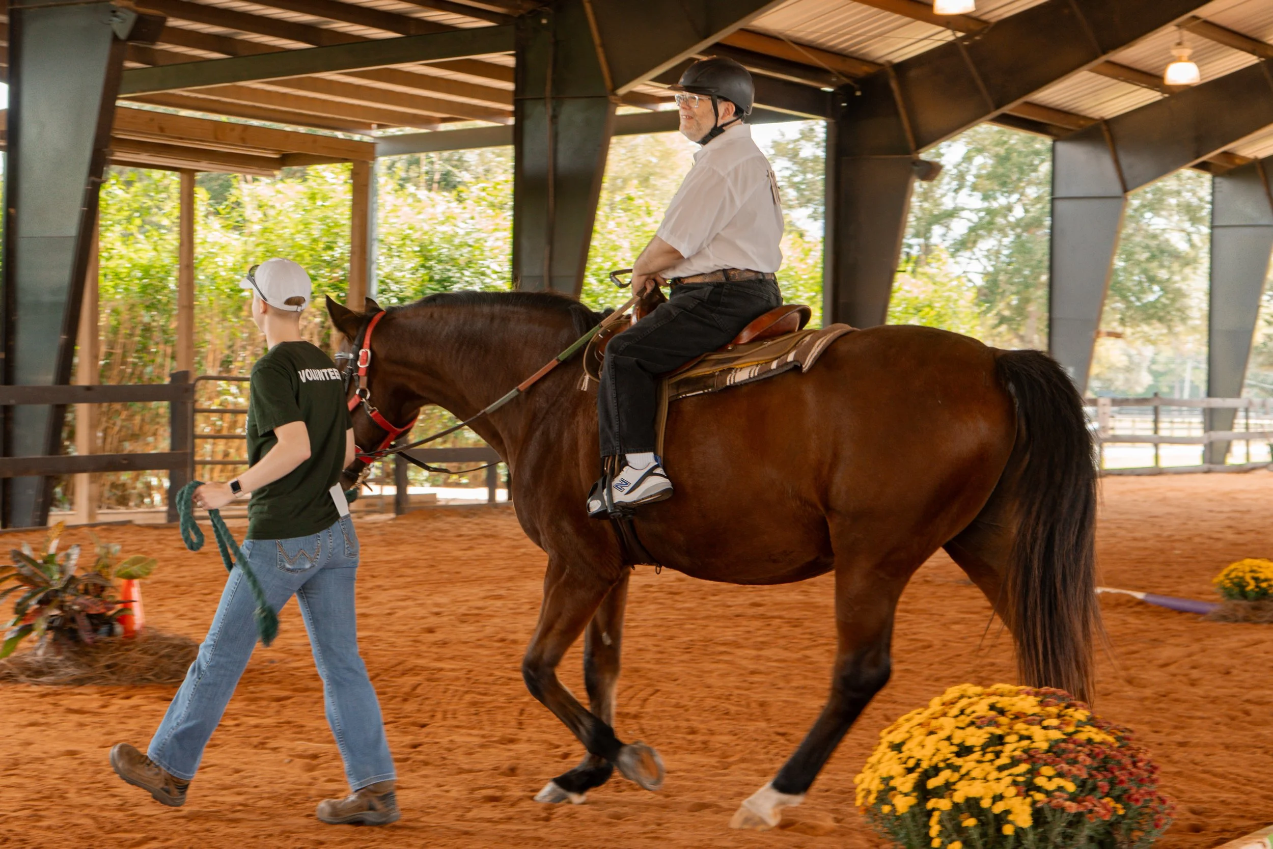 A volunteer can help in many ways such as leading, side walking, being a spotter, grooming and exercising horses. No horse experience is necessary. All volunteers are required to attend a training session before being scheduled for classes. After training, we will schedule you according to our need and your availability.